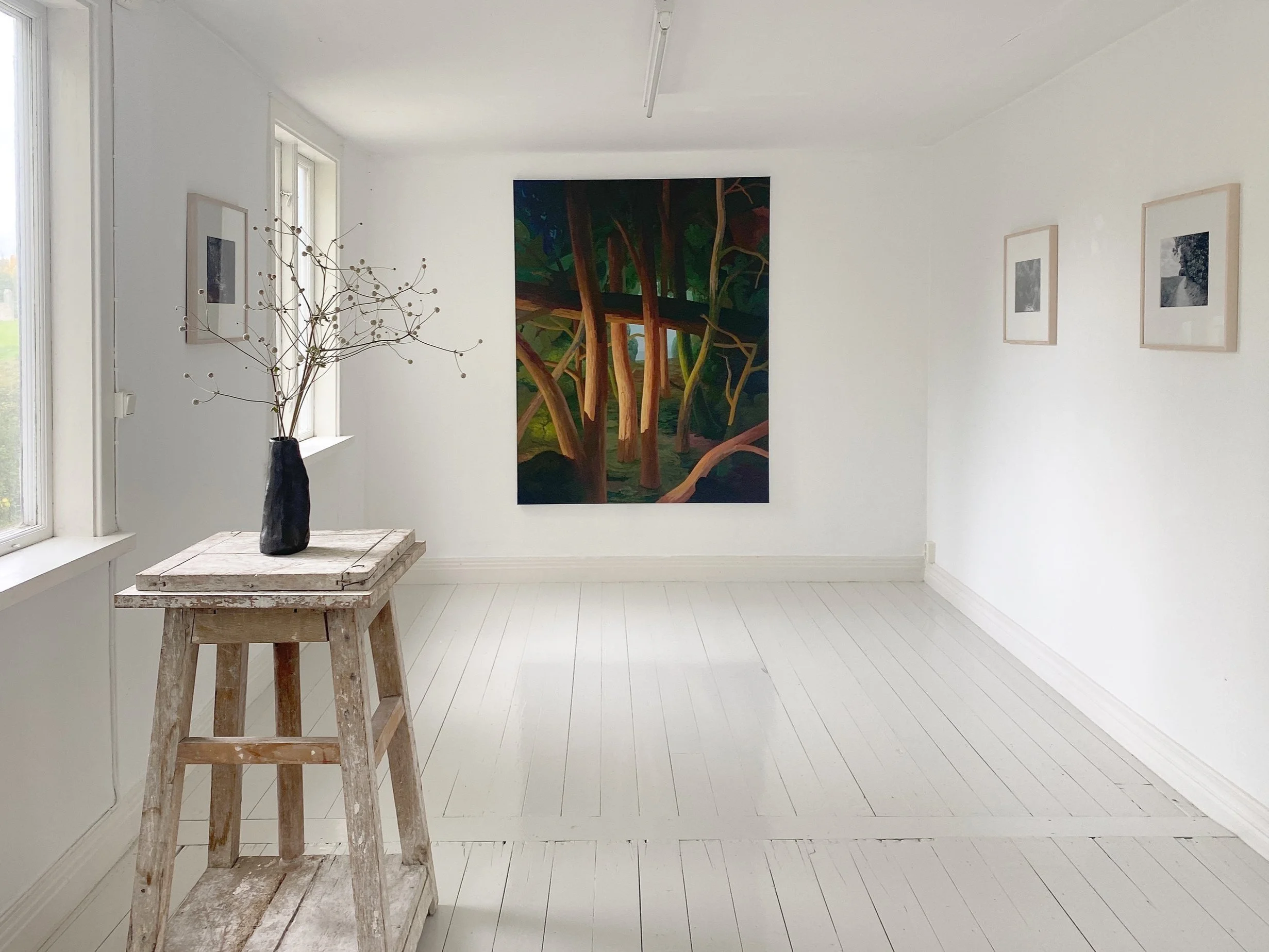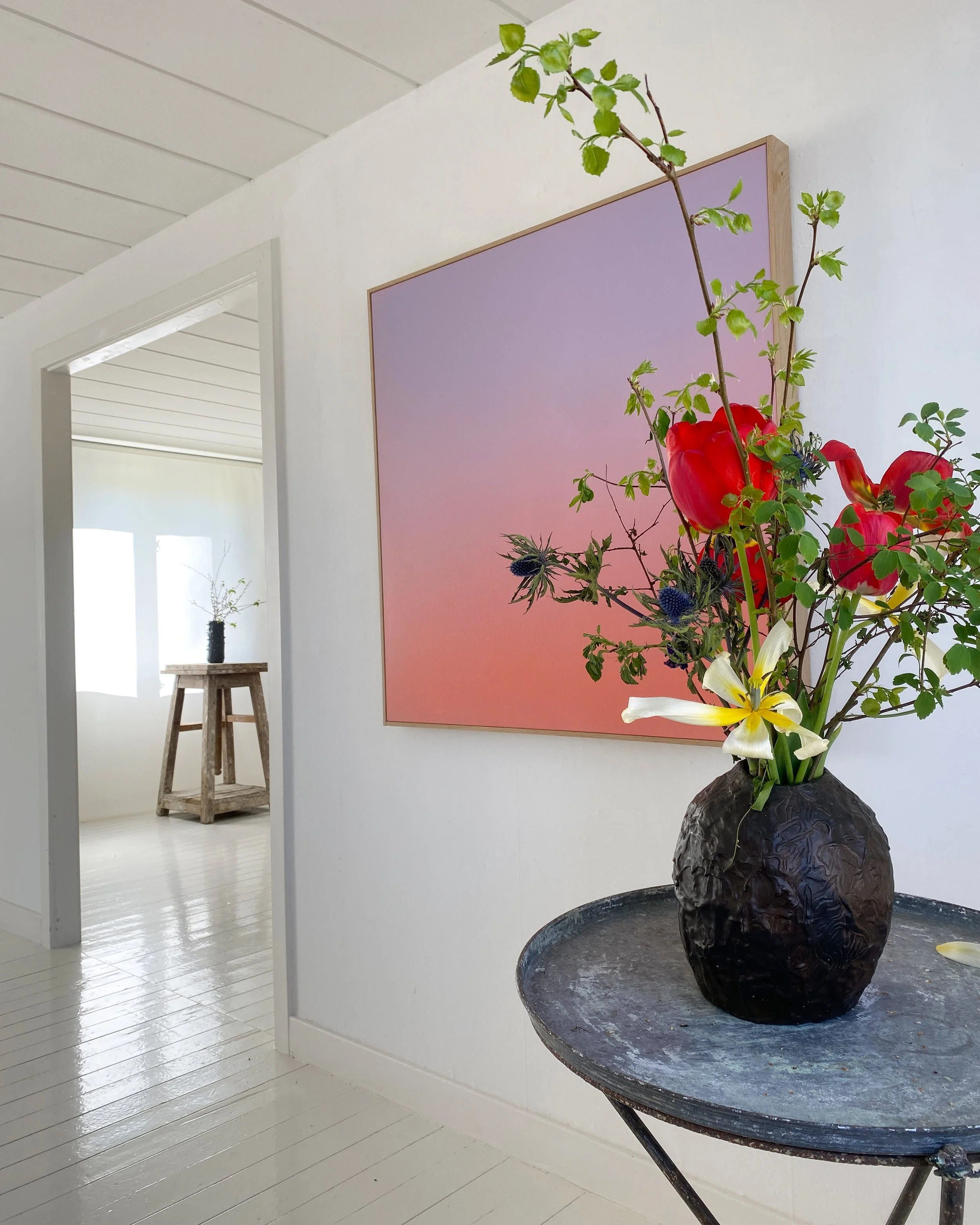 The house is simply furnished with elegant pieces that create a calm atmosphere. Soft light fills the space, and fresh flowers sit on the table. It’s a place where visitors can enjoy the art in a peaceful setting.