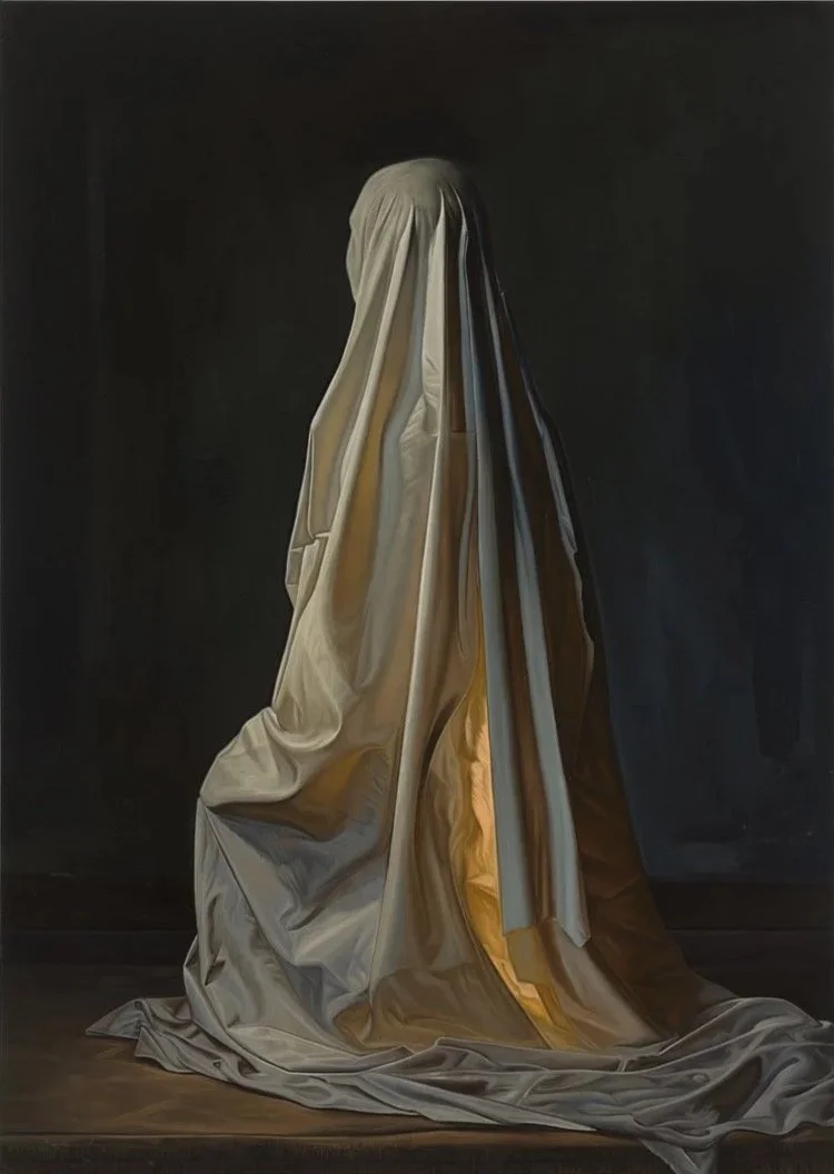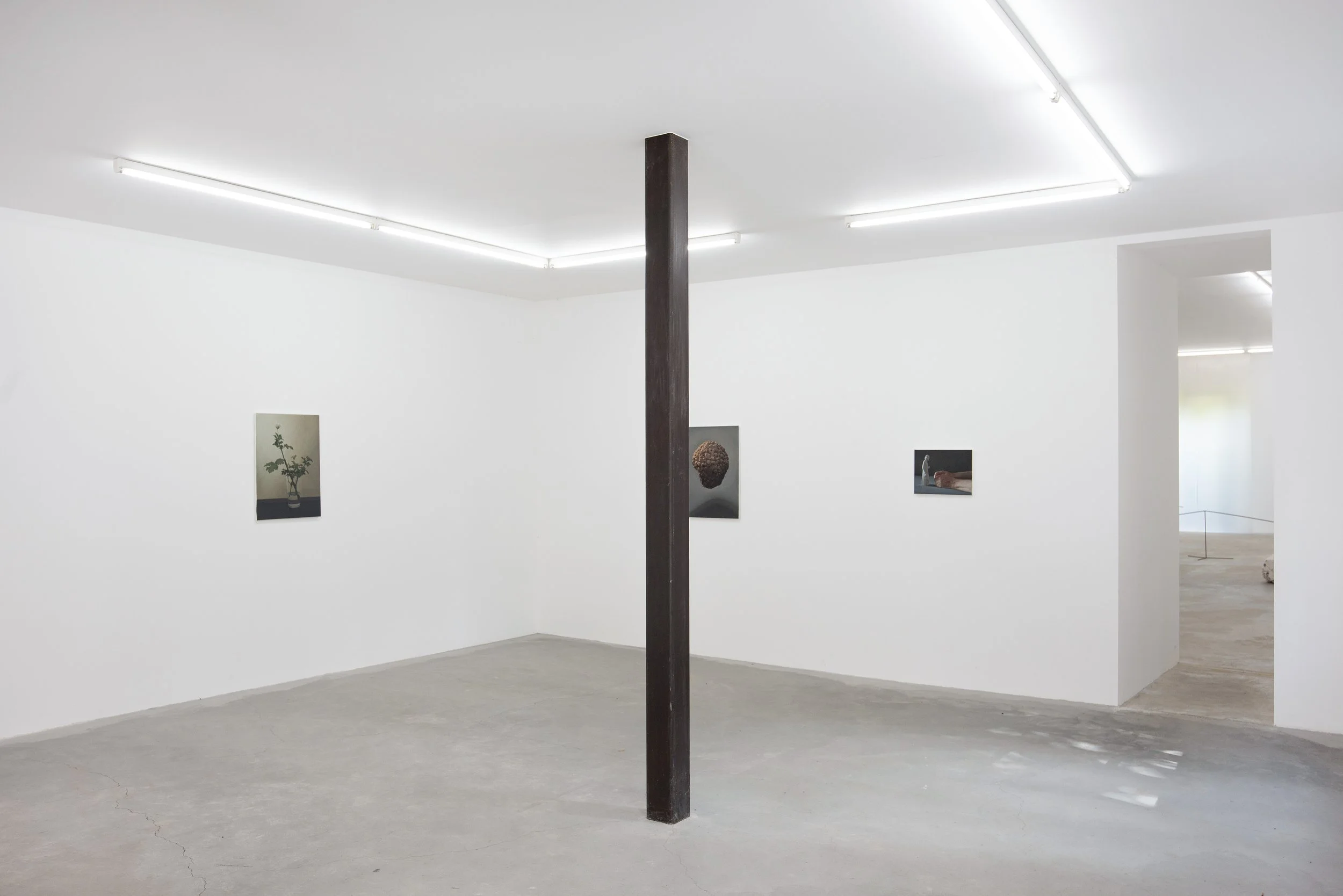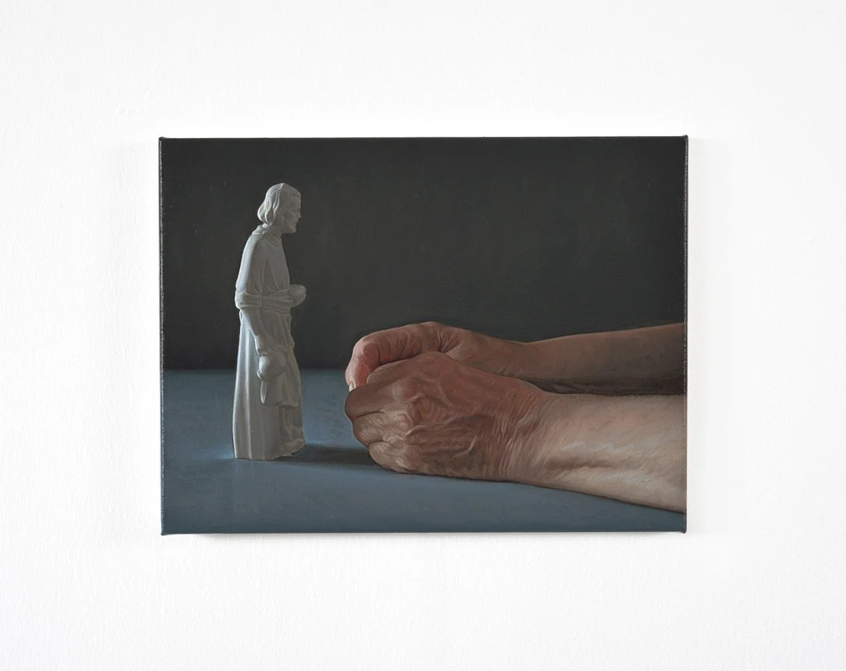 The exhibition features images of objects and materials, painted not as traditional still lives but more like portraits. A damaged stone head floats in mid air, a pair of cut branches of a geranium in a glass of water stretches up to reach the light above, a small statue of a man seems to study a couple of elderly human hands. These are depictions of emotions, of human experience, mostly devoid of physical human presence.