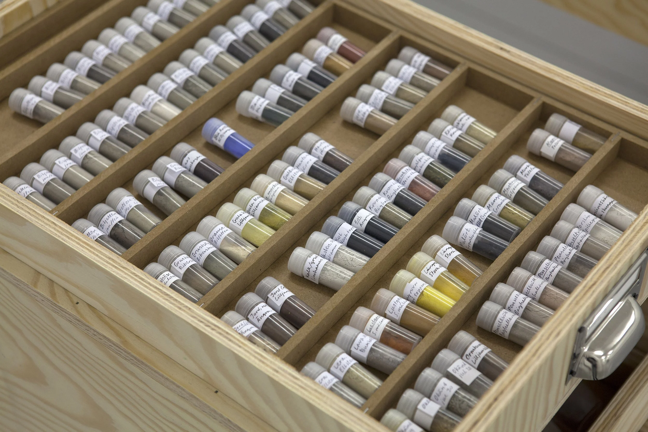 Olle Helin arbetar med måleri, och intresserar sig för pigment och dess koppling till specifika platser. Sedan 2017 gör han sin egen färg av material som han hittar i nära omgivningar, till exempel på gator och byggarbetsplatser eller i naturen. Det är en enkel handling som vidgar måleriet: färgen laddas med möda och platsspecificitet.